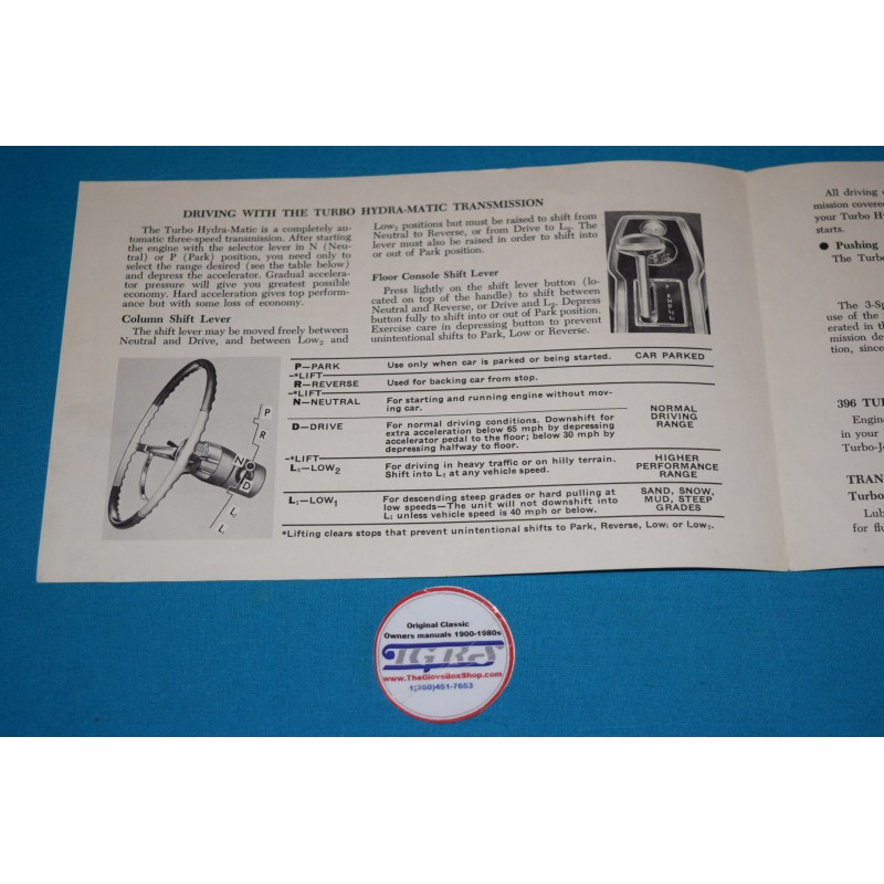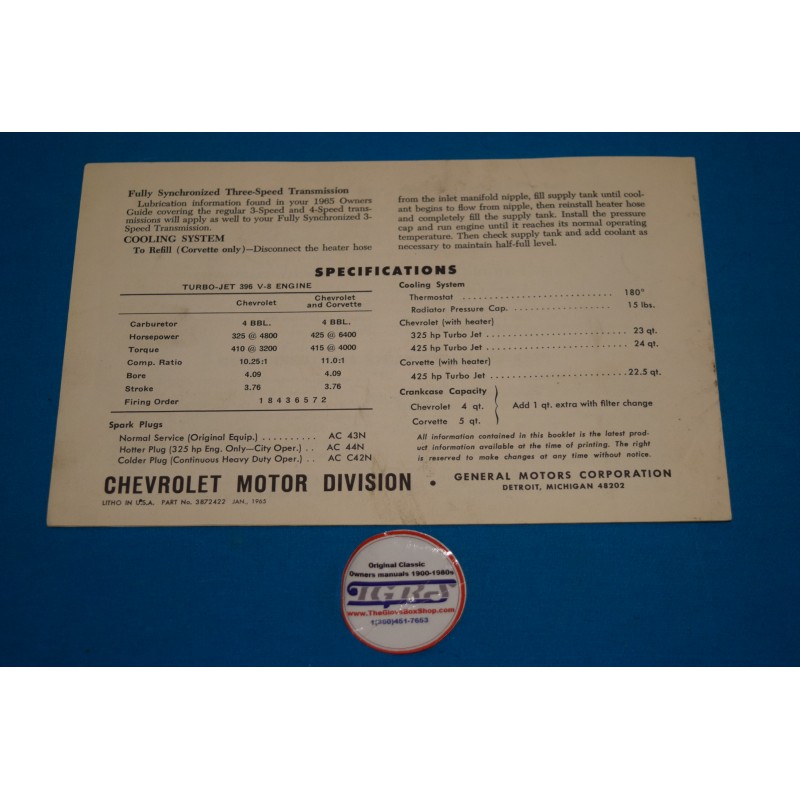 1965 Chevrolet Corvette / Impala / Chevelle 396 Owners manual insert